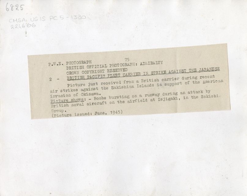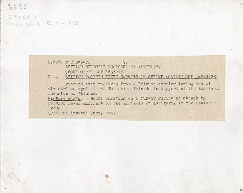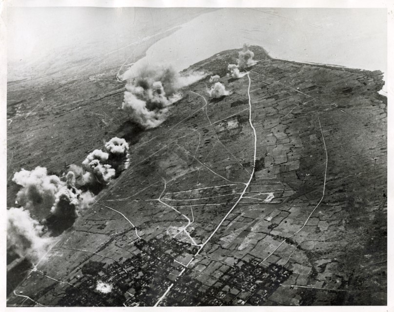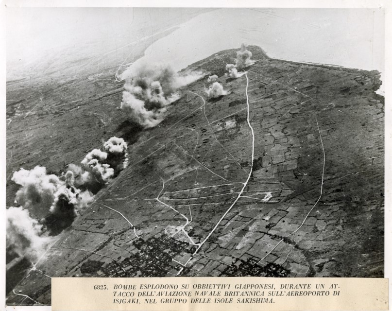 Veduta aerea di un attacco dell'Aviazione britannica sull'aeroporto di Isjigaki, isola del gruppo delle Sakishima, avvenuto nel giugno 1945.