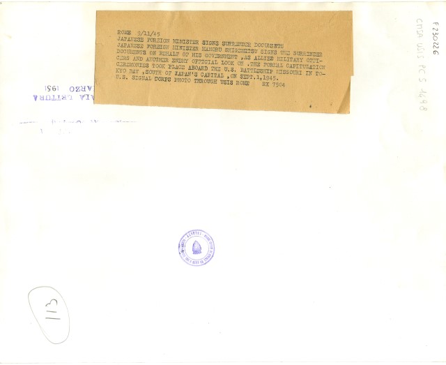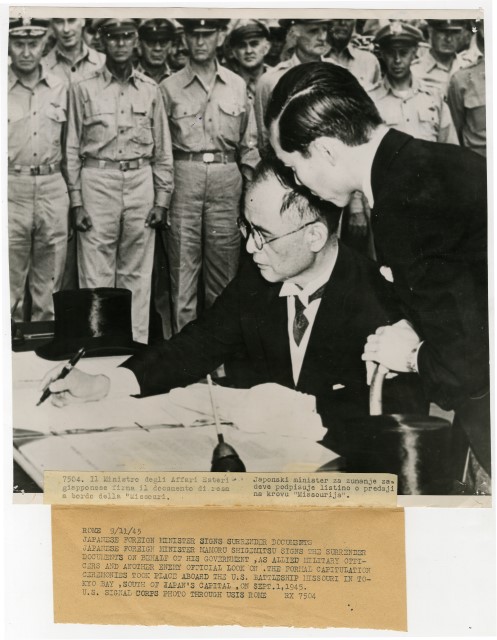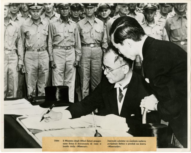 Il Ministro degli Affari Esteri giapponese Mamoru Shigemitsu firma i documenti di resa del Giappone nel settembre 1945.