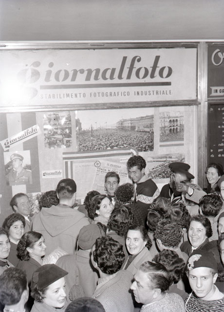 In Galleria Rossoni, la gente si accalca davanti alle vetrine di Giornalfoto che espongono le fotografie degli avvenimenti del giorno precedente, con l'arrivo delle truppe italiane a Trieste.