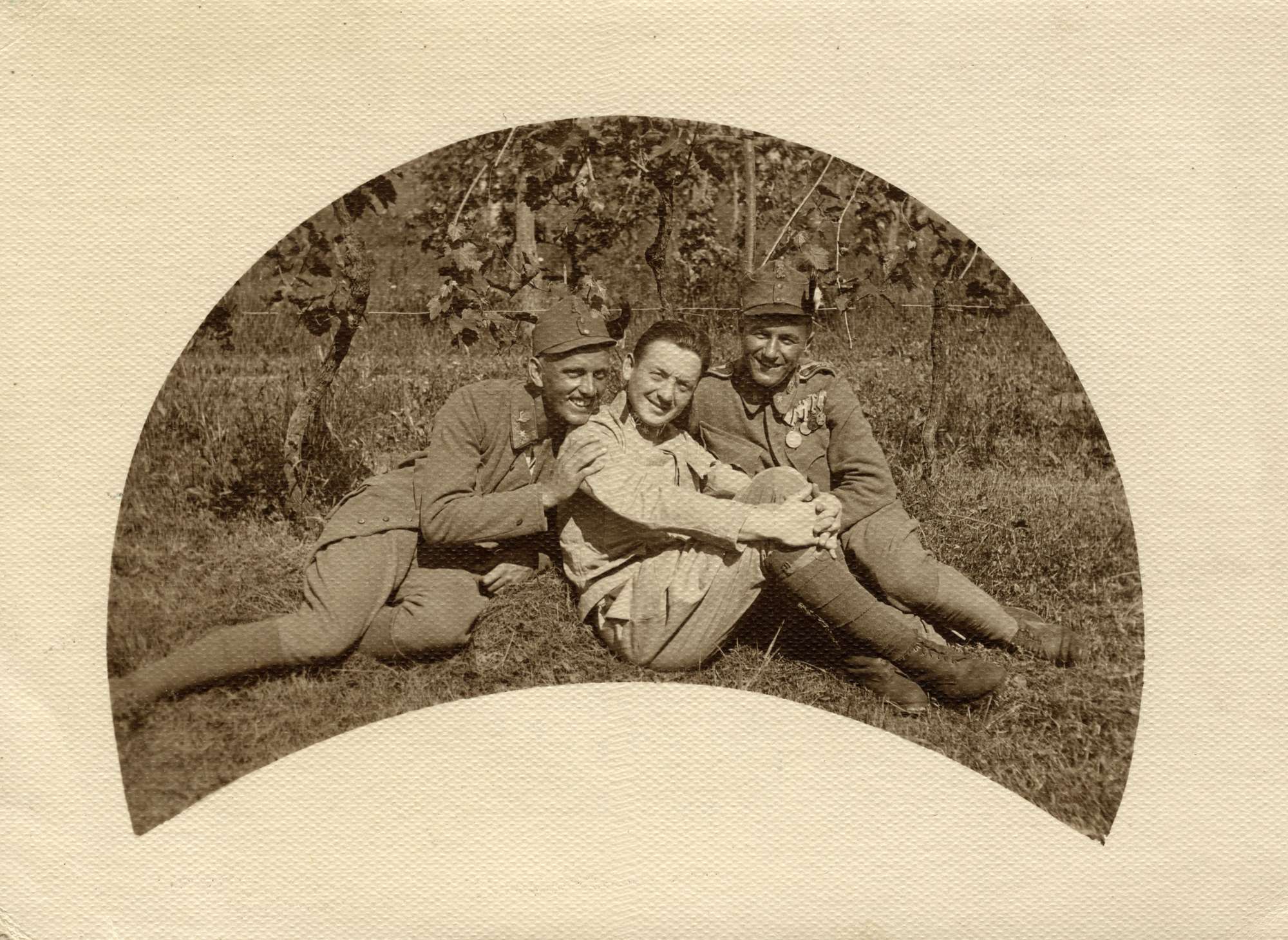 Le foto descrivono Mario Slavich in diverse occasioni. In divisa a cavallo, tra due commilitoni senza uniforme, con due soldati. A Rivignano con Angela. Mario, il primo a sinistra, un civile ed un gruppo di soldati davanti ad una caserma. Mario tra due soldati. Maria, Angela e Mario soldato con il bracciale della Croce Rossa. Ancora Mario mentre esegue una medicazione.Mario a figura intera