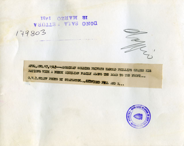 AMERICAN SOLDIER PRIVATE HAROLD PHILLIPS SHARES HIS RATIONS WITH A NEEDY SICILIAN FAMILY ALONG THE ROAD TO THE FRONT