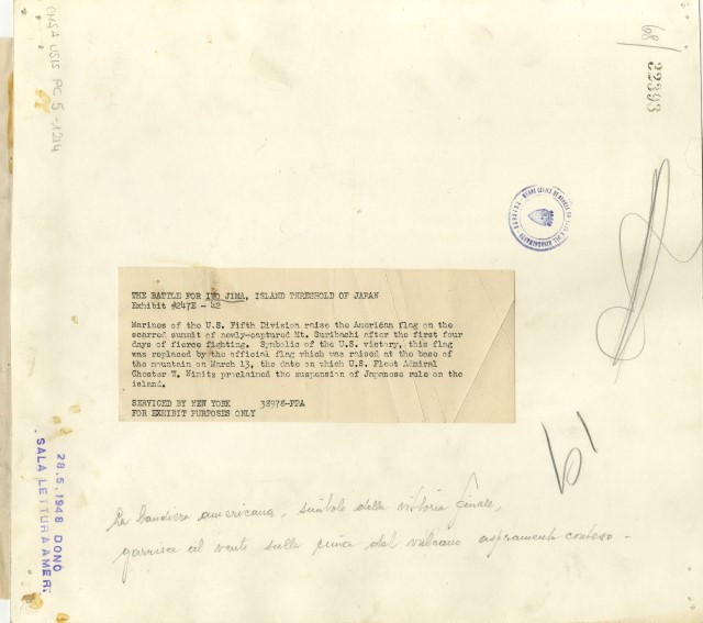 Soldati statunitensi in posa dopo aver issato la bandiera americana sul Monte Suribachi, sull'isola di Iwo Jima. La foto è stata premiata con il premio Pulitzer nel 1945. Nella copia presente nel National Archives Catalog, visibile all'indirizzo: https://catalog.archives.gov/id/74250597: la descrizione cita il nome del fotografo