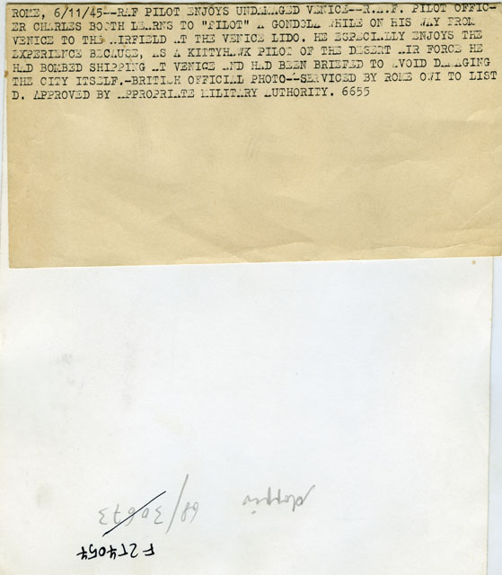 R.A.F. PILOT OFFICER CHARLES BOSTH LEARNS TO "PILOT" A GONDOLA WHILE ON HIS WAY FROM VENICE TO THE AIRFIELD AT THE VENICE LIDO.