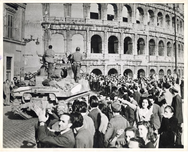 CARRI ARMATI DELLA V ARMATA ALLEATA PASSANO VICINI AL COLOSSEO, IN MEZZO A FOLLE PLAUDENTI DI CIVILI ITALIANI, NEL GIORNO DELLA LIBERAZIONE DELLA CAPITALE D'ITALIA