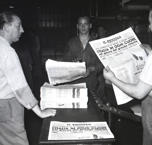Viene stampata e impaginata l'edizione de Il Piccolo del 26 ottobre 1954: l'antica testata si fonde con quella del Giornale di Trieste, in occasione del ritorno all'Italia. Seguono le manifestazioni di entusiasmo della folla in attesa dell'arrivo dei militari italiani per il passaggio delle consegne.