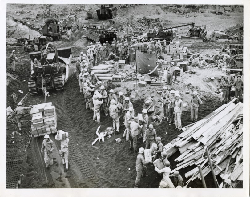 Marinai americani caricano e trasportano provviste durante la battaglia di Iwo Jima.