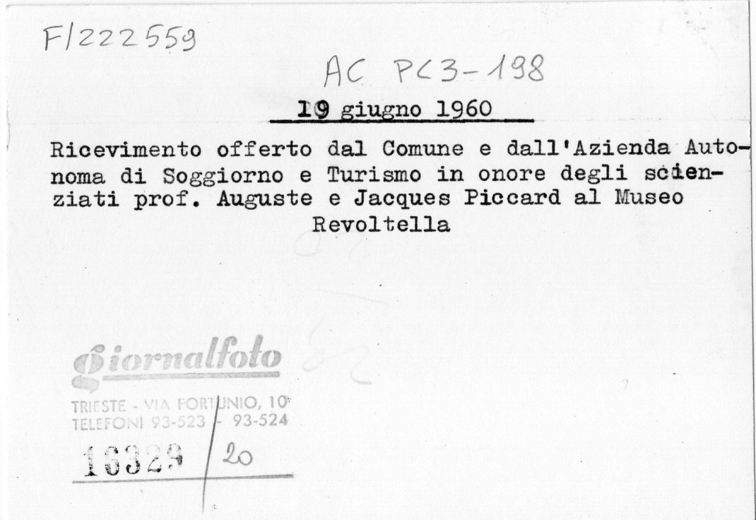 HomeRicevimento offerto dal Comune e dall'Azienda Autonoma di Soggiorno e Turismo in onore degli scienziati prof. Auguste e Jacques Piccard al Museo Revoltella