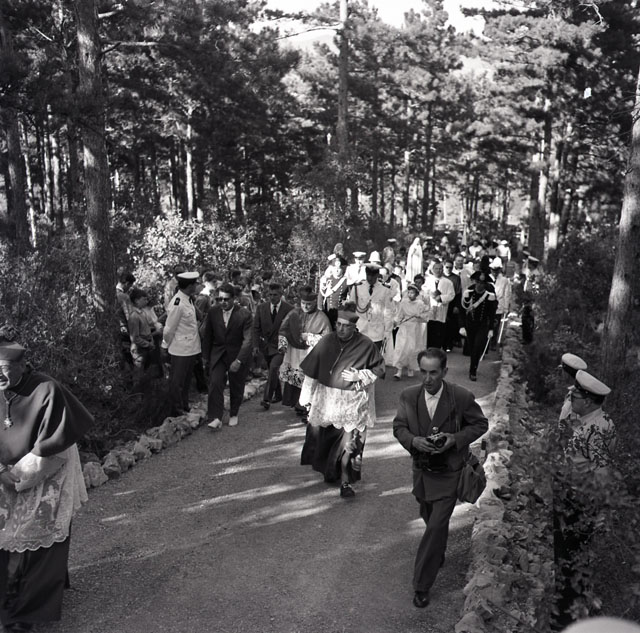 Il cardinale Lercaro, assistito dai monsignori Rovis e Dagri, benedice la pietra carsica durante il rito della sua consacrazione celebrata sul Monte Grisa, dove sorgerà il Tempio Mariano. Il cardinale Lercaro giunge a Trieste con il cardinale Urbani.