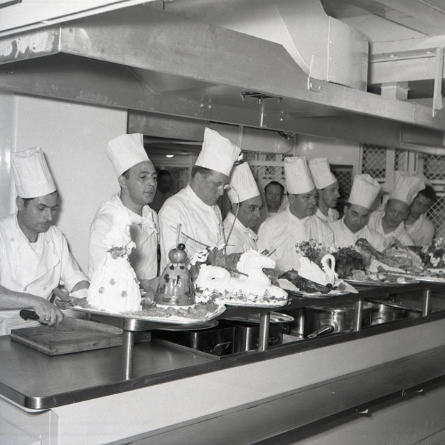 Croceristi ripresi sulla nave. Gli interni della Motonave Victoria: la cucina, il ristorante, la sala da ballo.