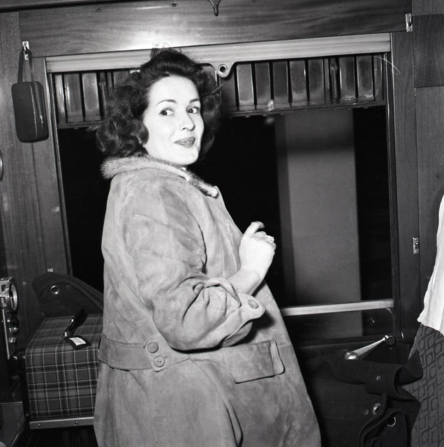 Ugo Borsatti corre in stazione a mezzanotte per immortalare Silvana Mangano (Roma, 1930-Madrid, 1989) nella carrozza letto del treno diretto a Belgrado. L’attrice deve concludere le riprese del film "La tempesta", ed è accompagnata dal marito Dino De Laurentiis (Torre Annunziata, 1919-Beverly Hills, 2010), dal regista Alberto Lattuada (Vapro d’Adda, 1914-Roma, 2005), dalle triestine Fulvia Franco (Trieste, 1931-Roma, 1988) e Anna Gruber (Trieste, 1929-2000). Il fotografo resta molto colpito dall’affabilità, dal modo di parlare della diva e dal suo profilo.