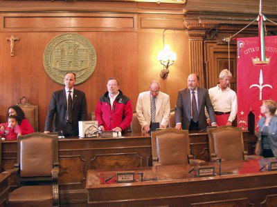 L'assessore Renzo Codarin ed il consigliere Piero Camber con i ragazzi dell'iniziativa Gioventù in Movimento assieme al presidente del Club Alpino Italiano Gabriele Bianchi e al presidente del Club de l'Arc Alpin Roberto de Martin ed ai rappresentanti dell'Unione Internazionale delle Associazioni Alpinistiche in occasione della manifestazione conclusiva legata all'anno internazionale della montagna.