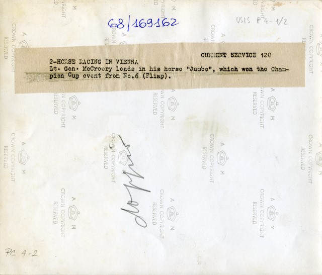 Il Generale McCreery con il suo cavallo, Jumbo, vincitore della corsa organizzata dai britannici a Vienna il 27 ottobre 1945