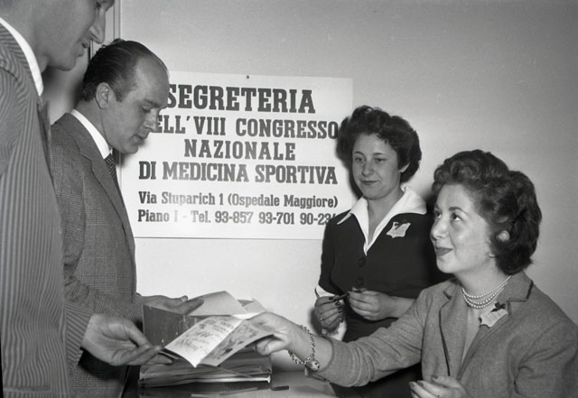 Nell'immagine un'insegna con la scritta Segreteria dell'VIII Congresso Nazionale di Medicina sportiva. Via Stuparich 1 (Ospedale Maggiore)
