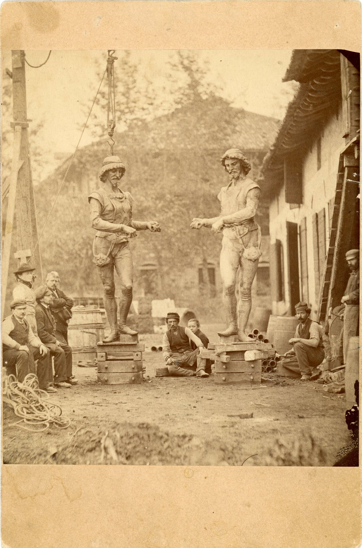Michez e Jachez, i due automi batti-ore, Michez e Jachez, modellati nel 1875 dallo scultore Giuseppe di Vittorio per la facciata del Palazzo Comunale di Trieste, qui fotografati nella fonderia di Cormons