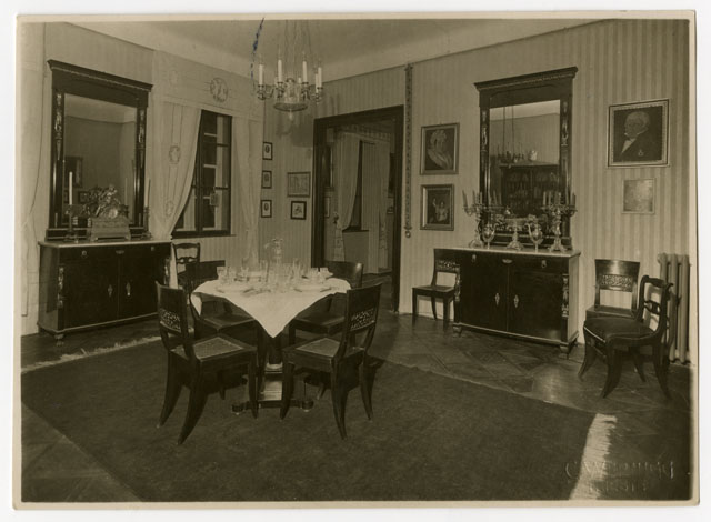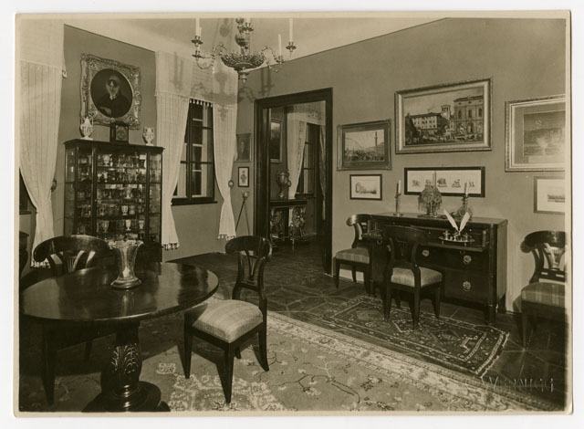 Mostra La casa dei nostri nonni : grande salone stile impero, camera da letto stile impero, anticamera, salottino di musica Biedermeier, salottino, salotto Biedermeier, camera da pranzo stile impero, salotto Biedermeier