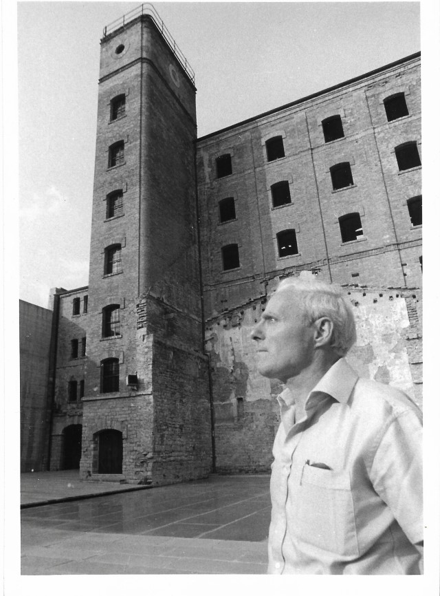 Mario Montanaro in cortile. Edificio centrale e piastra del forno sullo sfondo