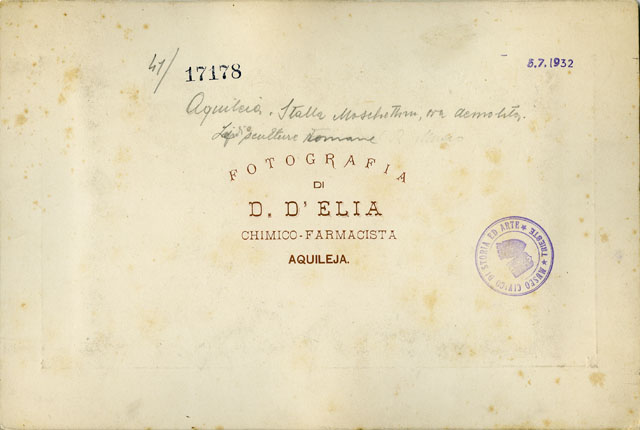 Particolare della facciata della cosiddetta "stalla" Moschettini costruita ad Aquileia nel 1824 da Gerolamo de Moschettini, funzionario del governo austriaco preposto alla tutela del materiale archeologico rinvenuto in città. Il fabbricato si caratterizzava per almeno due facciate costipate di rinvenimenti archeologici murati in modo affastellato e con accostamenti improbabili. È qui riprodotta una porzione di facciata nella quale si possono vedere reperti di tipologia e cronologia diversa quali iscrizioni, capitelli, statue, rilievi, lastre ornamentali e non solo, variamente inquadrabili tra l'età romana e cristiana, fittamente affiancati. Oggetto di un lungo contenzioso con le Autorità, che contestavano al proprietario di essersi appropriato illecitamente di beni pubblici, la stalla venne demolita nel 1887 e i materiali in essa murati confluirono al museo locale. Per un più ampio inquadramento dell'opera e delle vicende che la videro protagonista si rimanda alla scheda della fotografia F17174.