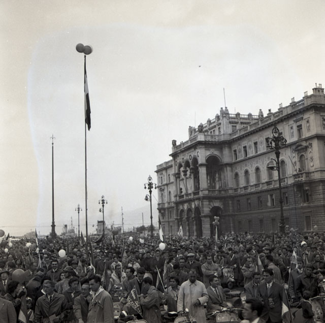 Presso il monumento ai Caduti di San Giusto il presidente del Vespa Club di Trieste Opiglia consegna la fiaccola a Tassinari, presidente del Vespa Club d'Italia e d'Europa. A seguire circa settanta vespisti di altrettante città d'Italia si recano in piazza Unità, ricevuti dal prosindaco Visintin. Nella piazza in festa gremita di gente alcuni vespisti in sella alle loro motociclette.