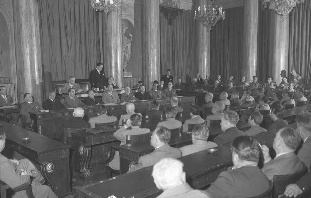 Il sottosegretario all'industria Emilio Battista visita gli impianti della raffineria Aquila e la zona industriale di Zaule. Riconoscibili il biscottificio Vidiz e lo stabilimento Kraftsack in costruzione. Presiede quindi l'assemblea degli industriali nella sala del Ridotto del teatro Verdi.
