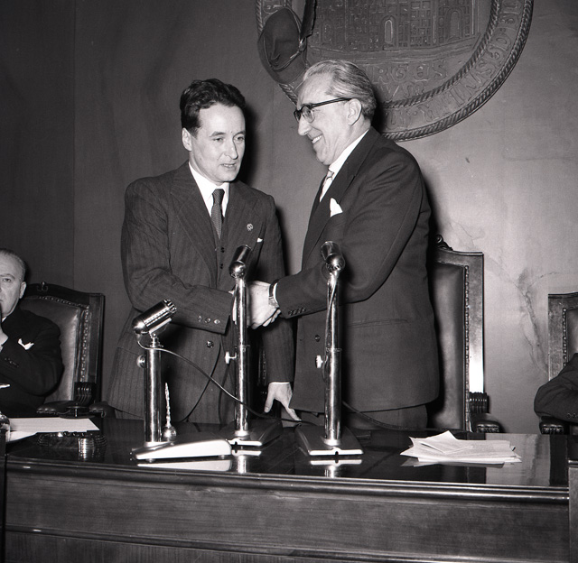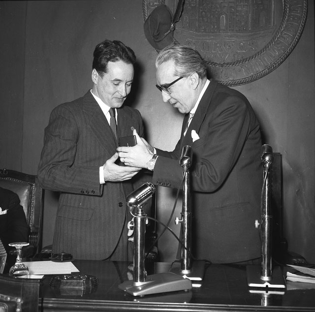 Il capitano Guido Musitelli, ufficiale triestino del 3. Reggimento artiglieria alpina della Julia, rientrato a casa dopo dodici anni di prigionia in Russia, viene ricevuto dal sindaco Bartoli