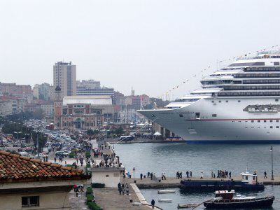 Vedute delle rive con la nave da crociera Carnival Conquest attraccata al molo della Stazione Marittima.