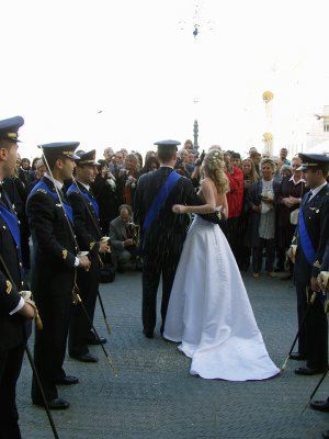 Il tenente dell'Aereonautica Marco Salvini e la moglie Carrie Michele Anderson passano sotto il ponte di spade.