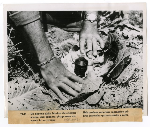 Un marinaio americano di istanza sull'isola di Okinawa mostra una granata giapponese nascosta all'interno di una pianta di cavolo.