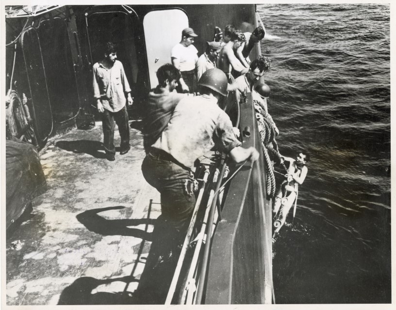 Un soldato giapponese che ha deciso di arrendersi viene aiutato da un gruppo di marinai a salire su una nave da guerra americana.