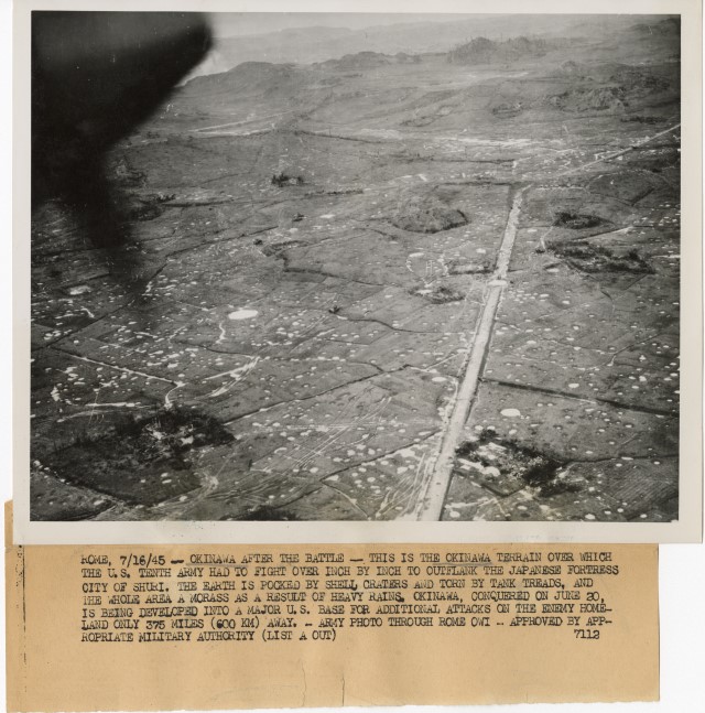 Veduta aerea di Okinawa dopo i bombardamenti aerei americani.