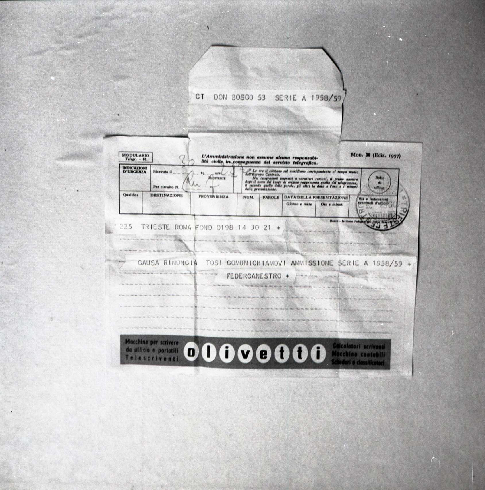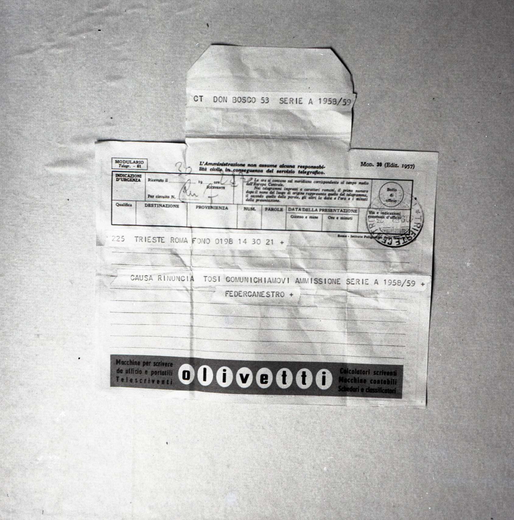 Pallacanestro: telegramma promozione squadra Don Bosco