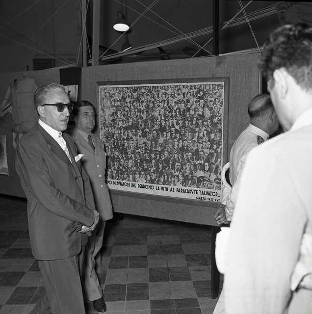 Il tenente colonnello dell'aeronautica Prospero Freri presenzia all'inaugurazione della Mostra storica del paracadutismo allestita alla Stazione marittima. Prospero Freri (Napoli, 18 marzo 1892 – Roma, 16 ottobre 1965) è stato un militare, aviatore e giavellottista italiano, pilota di grande esperienza del Corpo Aeronautico del Regio Esercito partecipò alla prima guerra mondiale venendo decorato con la croce di guerra al valor militare. Dopo la grande guerra fu l'inventore del paracadute italiano, pilota della Regia Aeronautica insignito della Medaglia d'argento al valore aeronautico ed uno dei tre creatori della Motobomba FFF. Notizia tratta da Wikipedia, ultima consultazione 6.08.2025