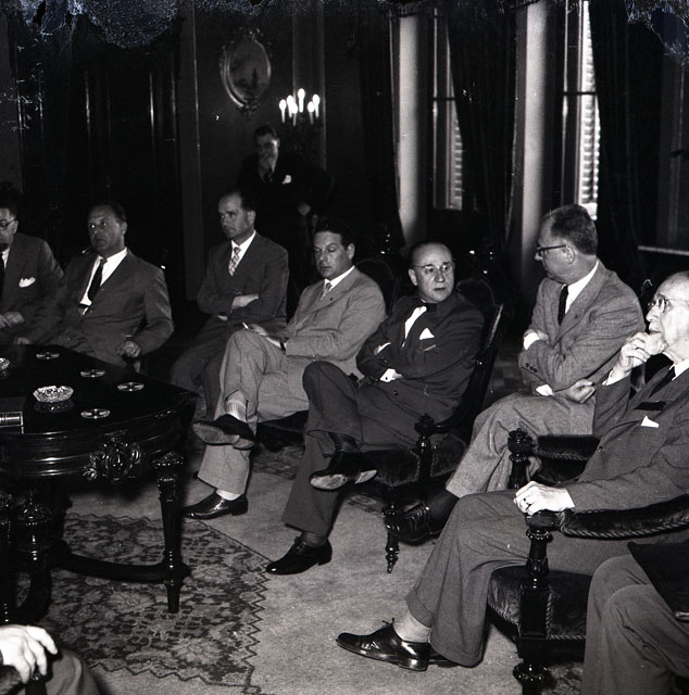 Visita in Municipio dell'on. Bruno Villabruna, deputato del Partito liberale italiano durante la 2. legislatura (25 giugno 1953-11 giugno 1958) e ministro dell'Industria e Commercio durante il governo Scelba (10 febbraio 1954-2 luglio 1955).