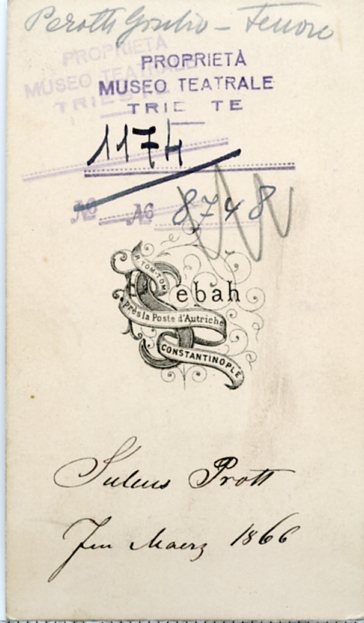 In costume. Alias Julius Prott, tenore, si è esibito in molte città d'Europa e d'America. Nel 1874 ha cantato al teatro Mauroner di Trieste nel "Trovatore". Appassionato di giardinaggio, alla fine della sua carriera si è stabilito a Trieste dove ha aperto un'azienda per la coltura delle rose riconosciuta a livello internazionale; si può anche ricordare lo storico negozio di fiori in Capo di Piazza.