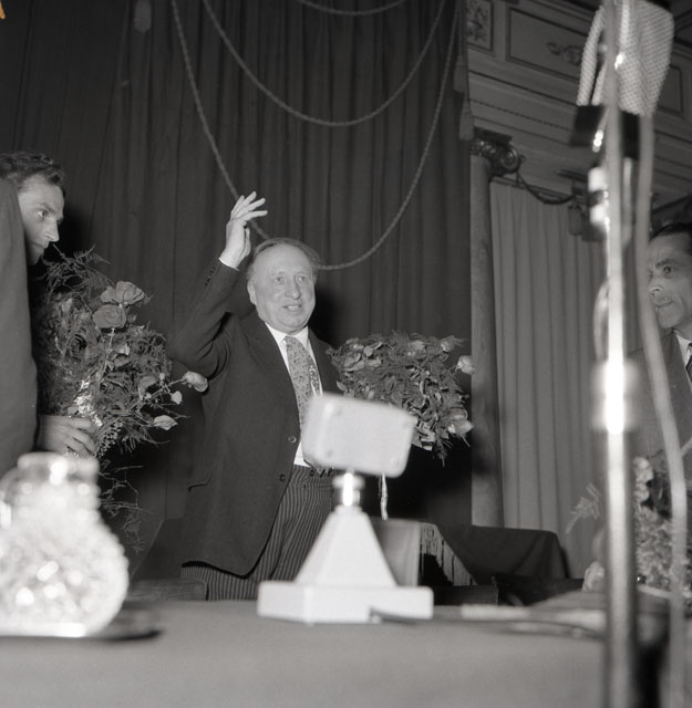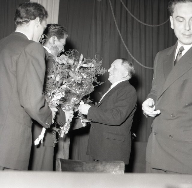 Presso il Circolo della Cultura e delle Arti si festeggia il maestro Cesare Barison. Il giovane allievo Perpich consegna una medaglia d'oro ricordo, opera dello scultore Marcello Mascherini