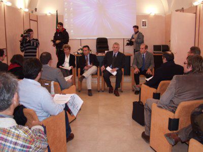 Gli assessori comunali Giorgio Rossi e Enrico Sbriglia durante la presentazione del Progetto nella Sala matrimoni del Municipio.