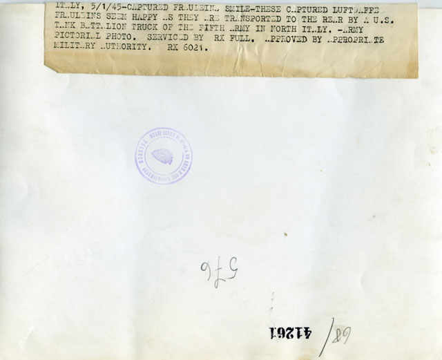 QUESTE FRAULEINS DELLA LUFTWAFFE, CATTURATE DAGLI ALLEATI NELL'ITALIA DEL NORD, SEMBRANO FELICI, MENTRE AUTOMEZZI DELLA 5 ARMATA LE TRASPORTANO NELLE RETROVIE.