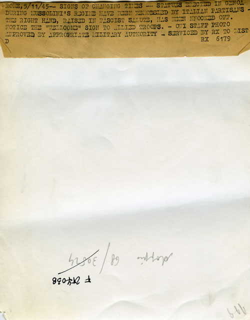 ECCO UNA STATUA FASCISTA RIMODERNΑΤΑ DAI PATRIOTI ITALIANI A GENOVA. LA MANO DESTRA ALZATA NEL SALUTO FASCISTA ESTATA AMPUTATA, MENTRE MANIFESTI DI BENVENUTO ALLE TRUPPE ALLEATE NE ADORNANO IL PIEDESTALLO.