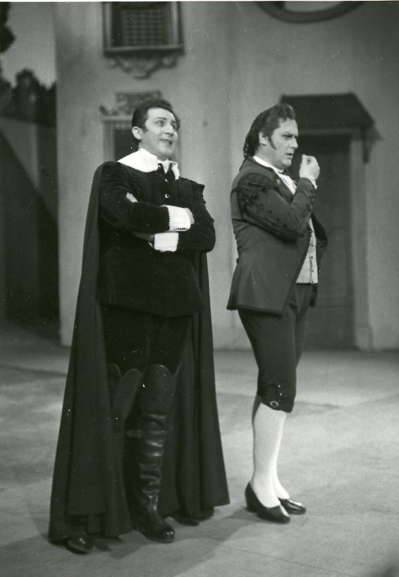 Umberto Grilli nel ruolo del Conte di Almaviva (a sx.) e Sesto Bruscantini nel ruolo di Figaro in Il Barbiere di Siviglia, Teatro Verdi, stagione 1963/64
