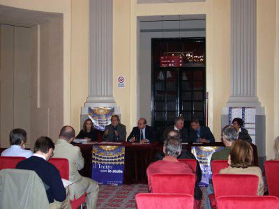 Il sindaco di Trieste Roberto Dipiazza con l'asssessore comunale Giorgio Rossi, il consigliere Paolo Rovis e l'architetto responsabile del progetto Luciano Celli durante la presentazione presso il Politeama Rossetti.