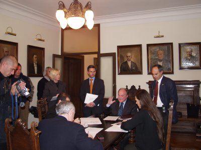 Il sindaco Roberto Dipiazza con l'assessore comunale Franco Frezza durante la conferenza stampa in Municipio. Presenti anche i consiglieri Salvatore Porro, Paolo Rovis ed Andrea Vatta