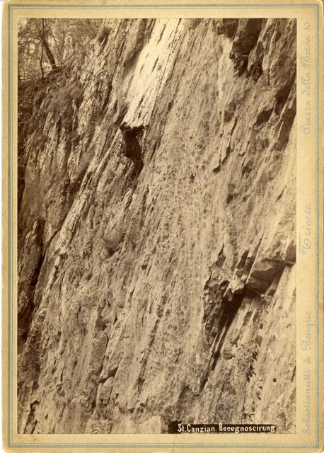 La fotografia ritrae un "grottenarbeiter" (lavoratore delle grotte) appeso alla fine di una campata di scale di corda nella Grande Voragine (Velika Dolina) di San Canziano sotto il punto panoramico della vedetta, non visibile, a circa 200 metri di altezza. A sinistra, nella parte alta della fotografia si nota lo steccato di contenimento del sentiero.