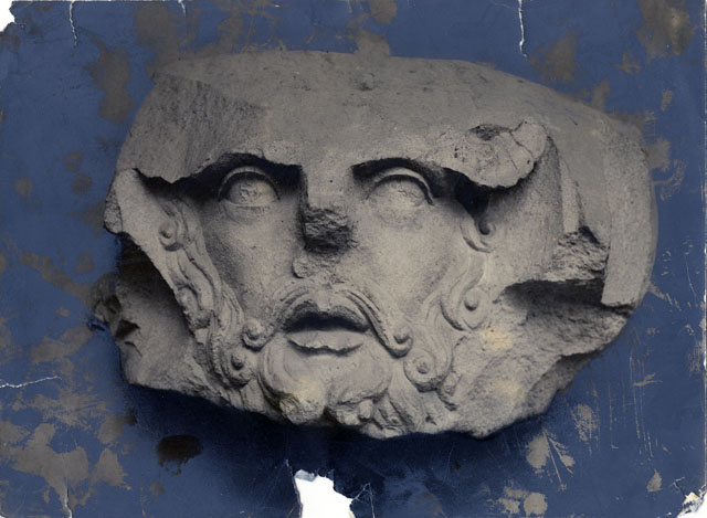 Rilievo con la testa di Giove Ammone trovato reimpiegato nel campanile della cattedrale di San Giusto. Il rilievo, che riproduce la divinità con le corna di ariete, decorava un plinto posto nella basilica civile o più probabilmente nel foro. Il sistema architettonico di cui faceva parte prevedeva plinti ornati con Giove Ammone alternati a plinti con Medusa, secondo una successione documentata anche nel foro della vicina Aquileia. L'opera si data alla metà del II sec. d.C.