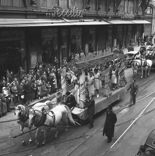Sfilata di carri allegorici per le vie del centro; Ketty Burba, Miss Trieste 1951, in posa accanto ai grappoli; festa al castello di San Giusto.