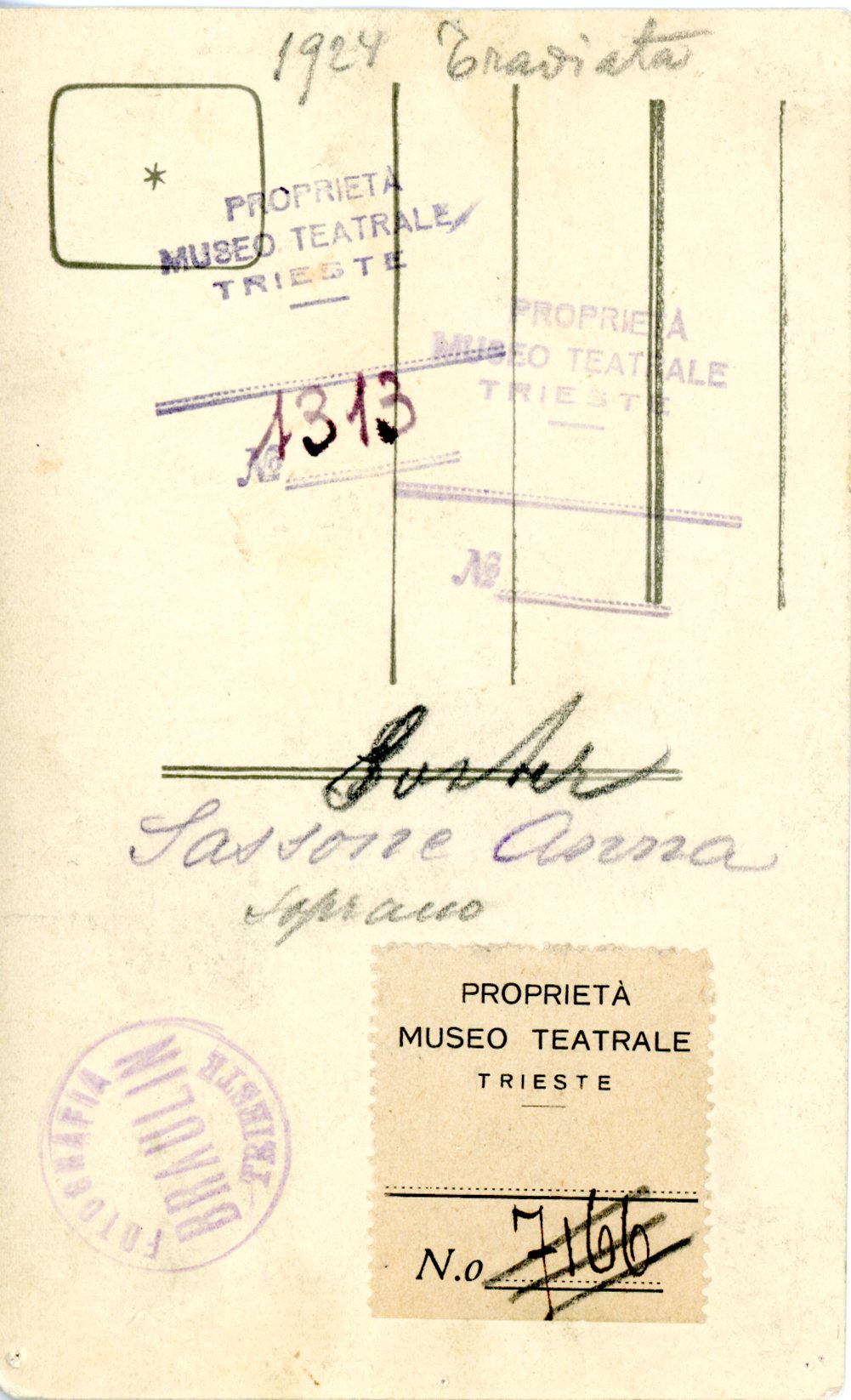 In costume di scena, nel ruolo di Scampolo nell'opera omonima. A Trieste ha cantato al teatro Verdi nel 1924 alla prima assoluta di "Scampolo" e nel 1925 in "Traviata"