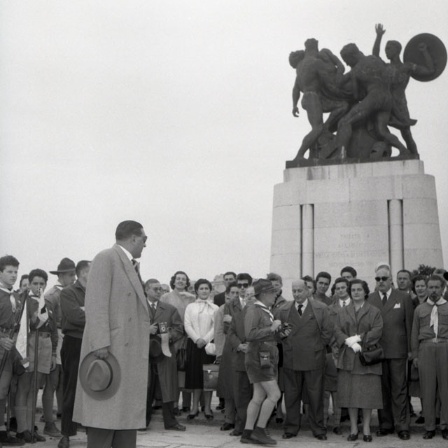 Una rappresentanza della sezione di Vicenza dei Giovani Esploratori Italiani restituisce alla Sezione di Trieste in una cerimonia sul colle di San Giusto, un tricolore ricevuto in consegna nel 1946. Testo tratto da Il Piccolo, 31.10.1954, p. 2