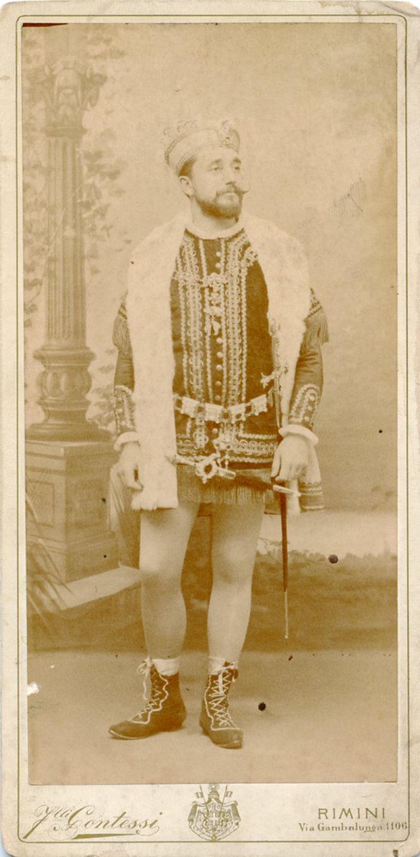 In costume nel ruolo di Alfonso in "La favorita". Cantò al Politeama Rossetti di Trieste in concerto di beneficenza il 12.12.1888 , e il 15.11.1901 in concerto con la violinista Teresina Tua. 1889 a Parma nella "Carmen" e alla Scala di Milano in "Simon Boccanegra"; nel 1893 al Teatro Grande di Brescia in "Otello" nel 1895 in "Ruy Blas" e "Ernani" al Teatro Cressoni di Como