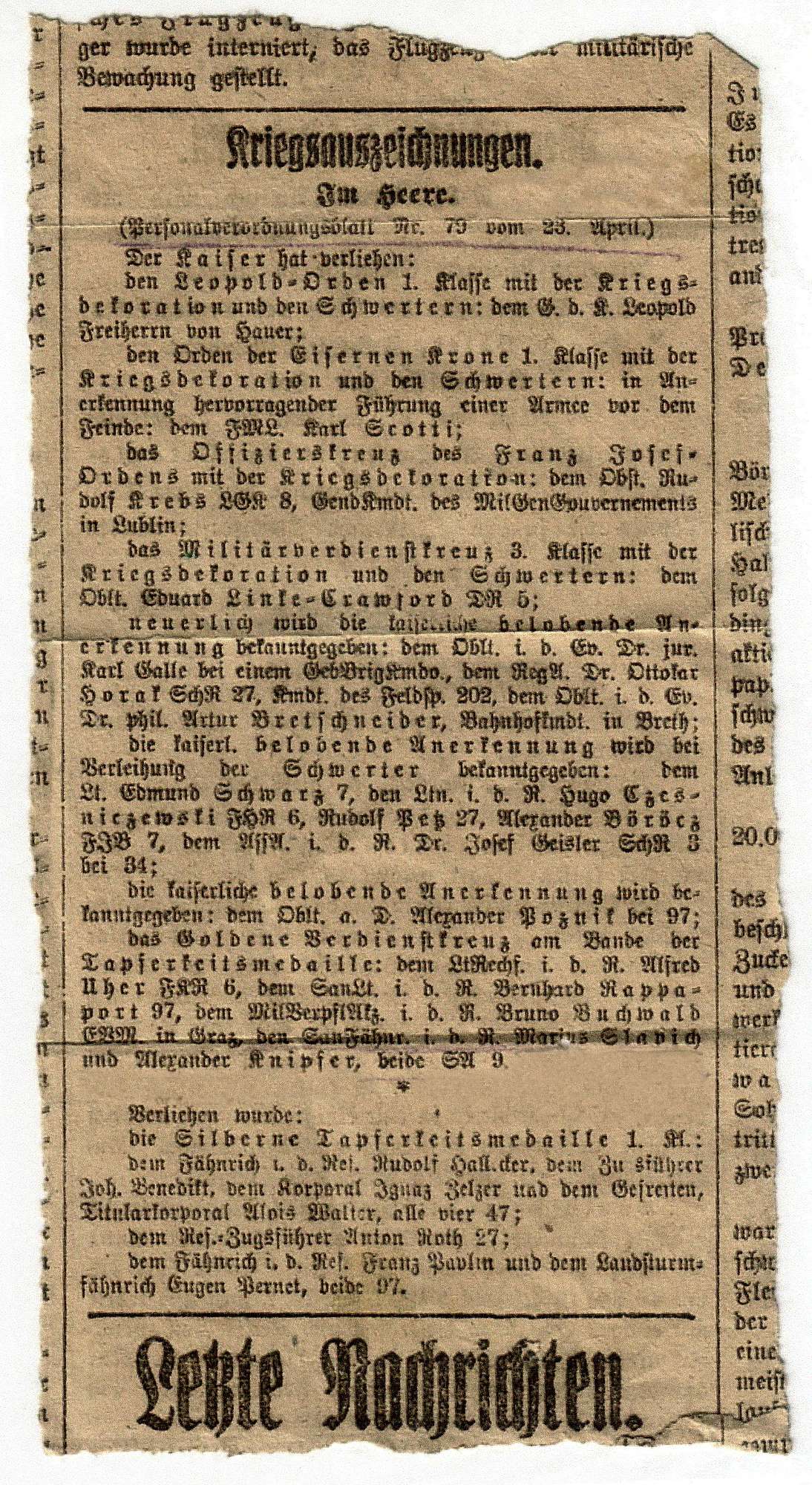 "Resoconto di guerra" n. 79 del 23 aprile 1916 Il ritaglio del giornale riporta una nota a matita in cui si specifica che la decorazione è stata consegnata il gg. 24 aprile 1917.