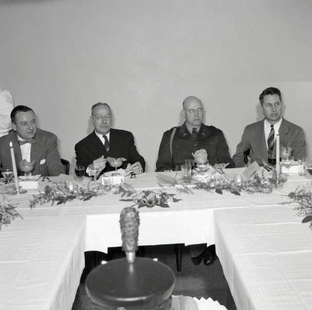 Gruppo di uomini, in divisa e in borghese, a tavola. Negli ultimi due fotogrammi la cucina dell'albergo
