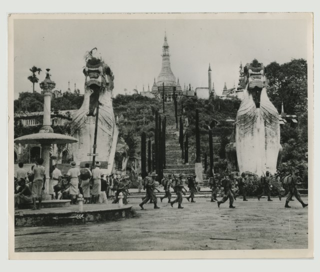Truppe alleate davanti ai Chinthe protettori di un tempio in Prome