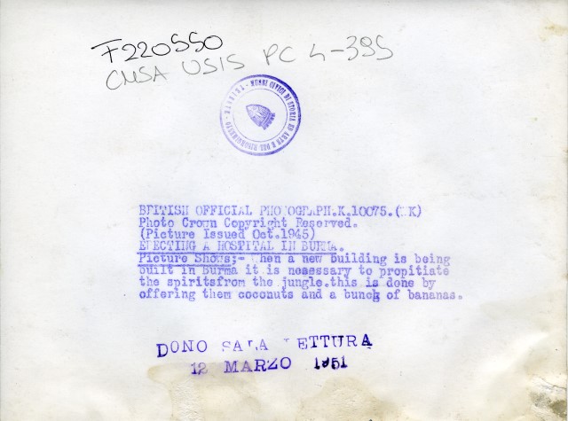 La didascalia riporta che quando è costruito un edificio a Burma è necessario appropiziarsi gli spiriti della giungla offrendo loro cocco e un casco di banane. La fotografia rappresenta il rito.